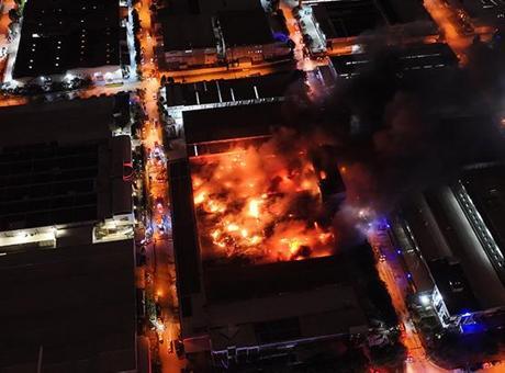 Polis ekipleri çevrede güvenlik önlemi alırken, itfaiye ekiplerinin yangına müdahalesi sürüyor.