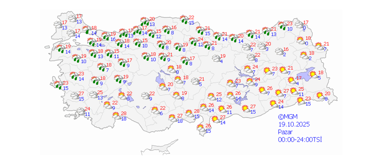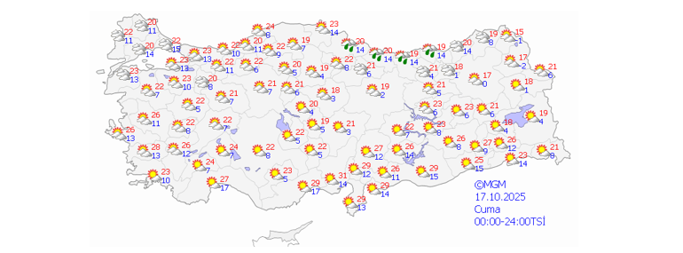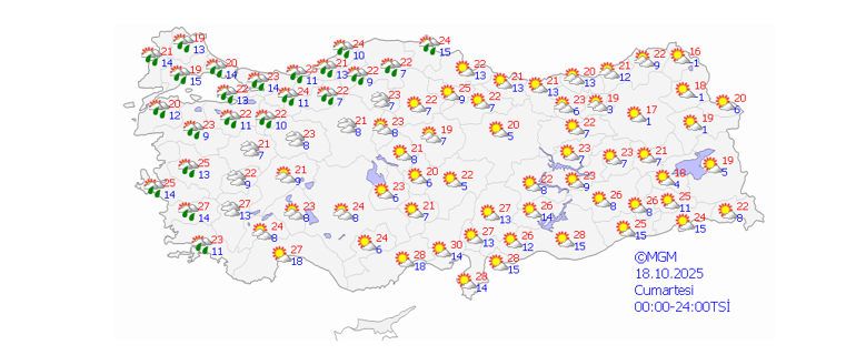 Meteoroloji Genel Müdürlüğü tarafından yapılan tahminlere göre: Ülkemizin kuzey kesimlerinin parçalı, yer yer çok bulutlu, Trakya ile Sinop ve Samsun çevrelerinin yağmur ve sağanak yağışlı, diğer yerlerin az bulutlu ve açık geçeceği tahmin ediliyor.