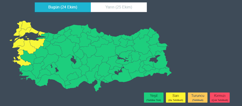 Meteorolji tarafından ‘sarı kod’lu uyarı verilen iller sırasıyla şöyle:Balıkesir, Bursa, Çanakkale, Edirne, İstanbul, İzmir, Kırklareli, Tekirdağ