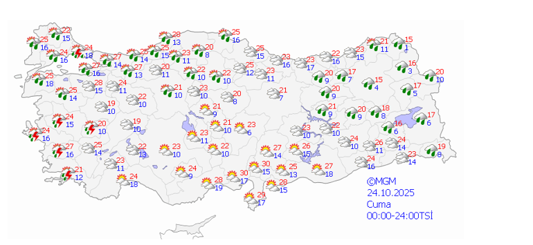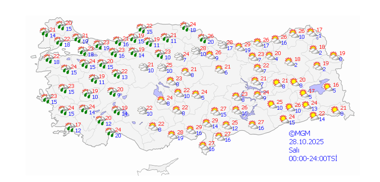 Meteoroloji Genel Müdürlüğü tarafından yapılan tahminlere göre; ülke geneli parçalı, yer yer çok bulutlu, Marmara, Kıyı Ege, İç Anadolu’nun kuzeybatısı, Batı Karadeniz, Doğu Karadeniz’in iç kesimleri ve Doğu Anadolu’nun kuzey ve doğusu ile Uşak ve Elazığ çevrelerinin yağmur ve sağanak, yurdun batı kesimlerin yer yer gök gürültülü sağanak, Doğu Karadeniz’in iç kesimlerinin yüksekleri ile Doğu Anadolu’nun kuzeydoğusunun yükseklerinin karla karışık yağmur ve yer yer kar yağışlı geçeceği tahmin ediliyor.