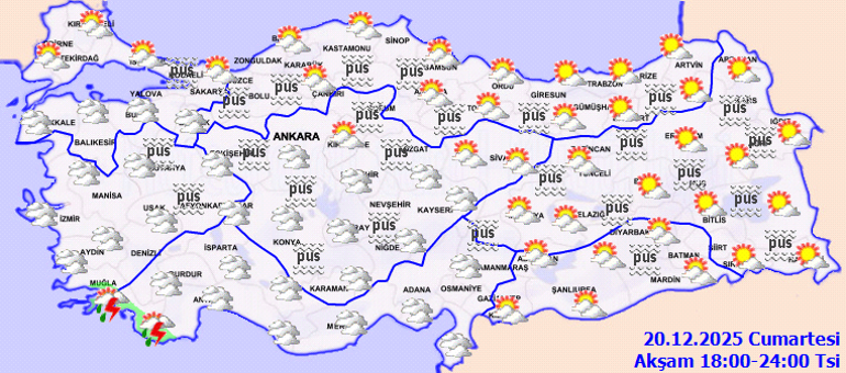 Meteoroloji Genel Müdürlüğü tarafından yapılan tahminlere göre: Ülkemiz genelinin parçalı yer yer çok bulutlu, Trakya, Ege, Batı Akdeniz, İstanbul çevreleri, Ankara ve Eskişehir’in güneyi ile Konya’nın kuzey ve batısının yağmur ve sağanak, Güney Ege ve Batı Akdeniz kıyılarının gök gürültülü sağanak yağışlı geçeceği tahmin ediliyor. Yağışların; Muğla ve Antalya çevrelerinde yerel kuvvetli olması bekleniyor. Gece ve sabah saatlerinde iç ve doğu bölgelerde pus ve yer yer sis bekleniyor.